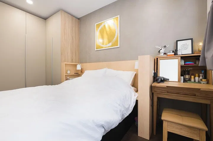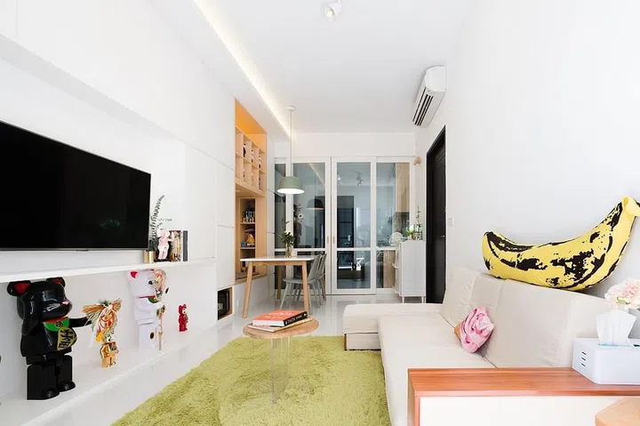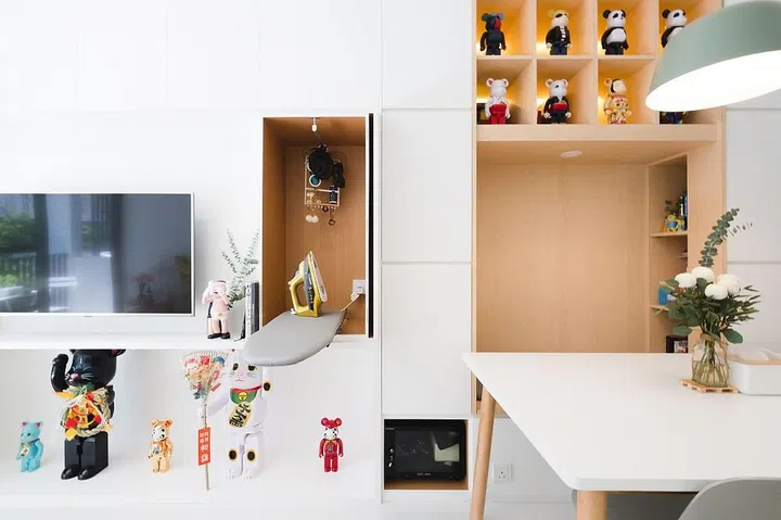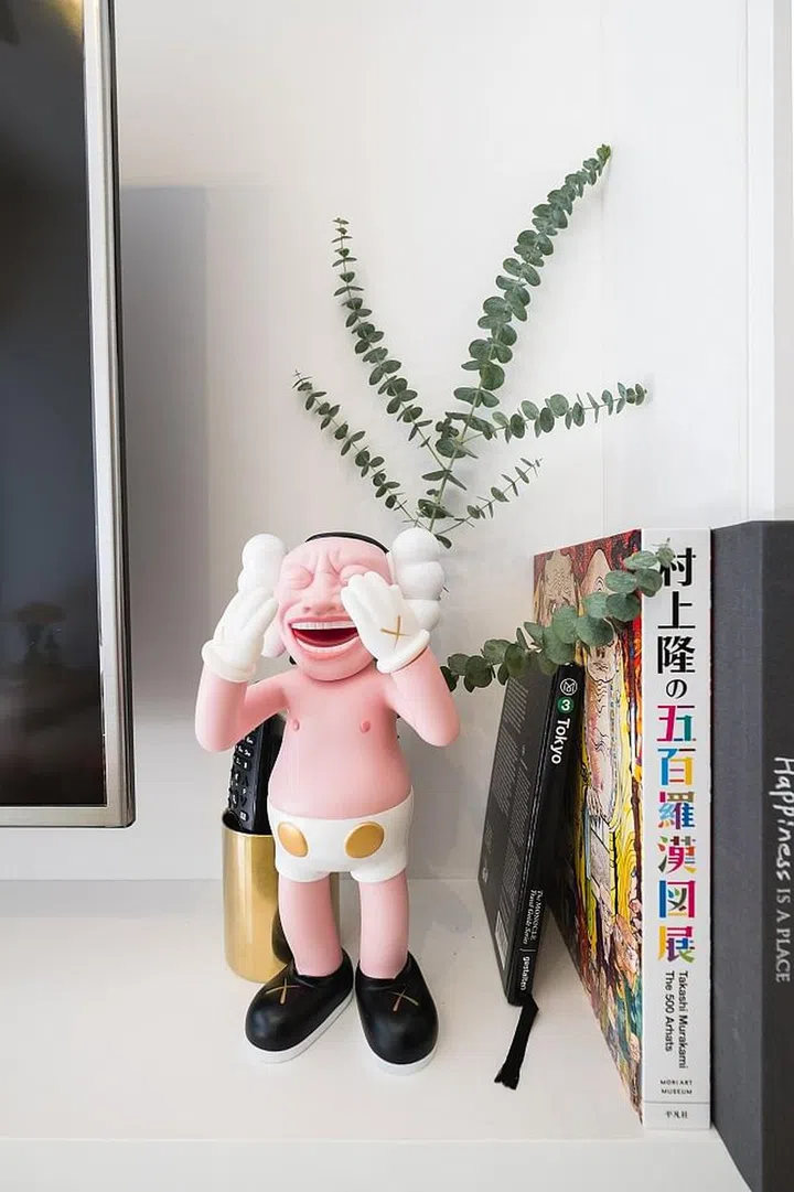 The couple has a large collection of colourful and quirky knick knacks and toys - they're a big fan of Bearbricks! - so the designers decided on a wood-and-white palette that will allow the designs to pop.