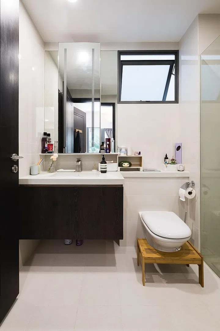 The bathroom was kept simple, with a black-and-white colour scheme.