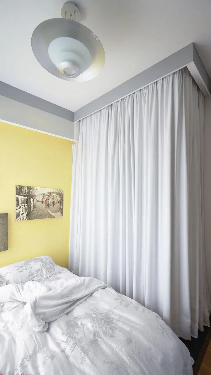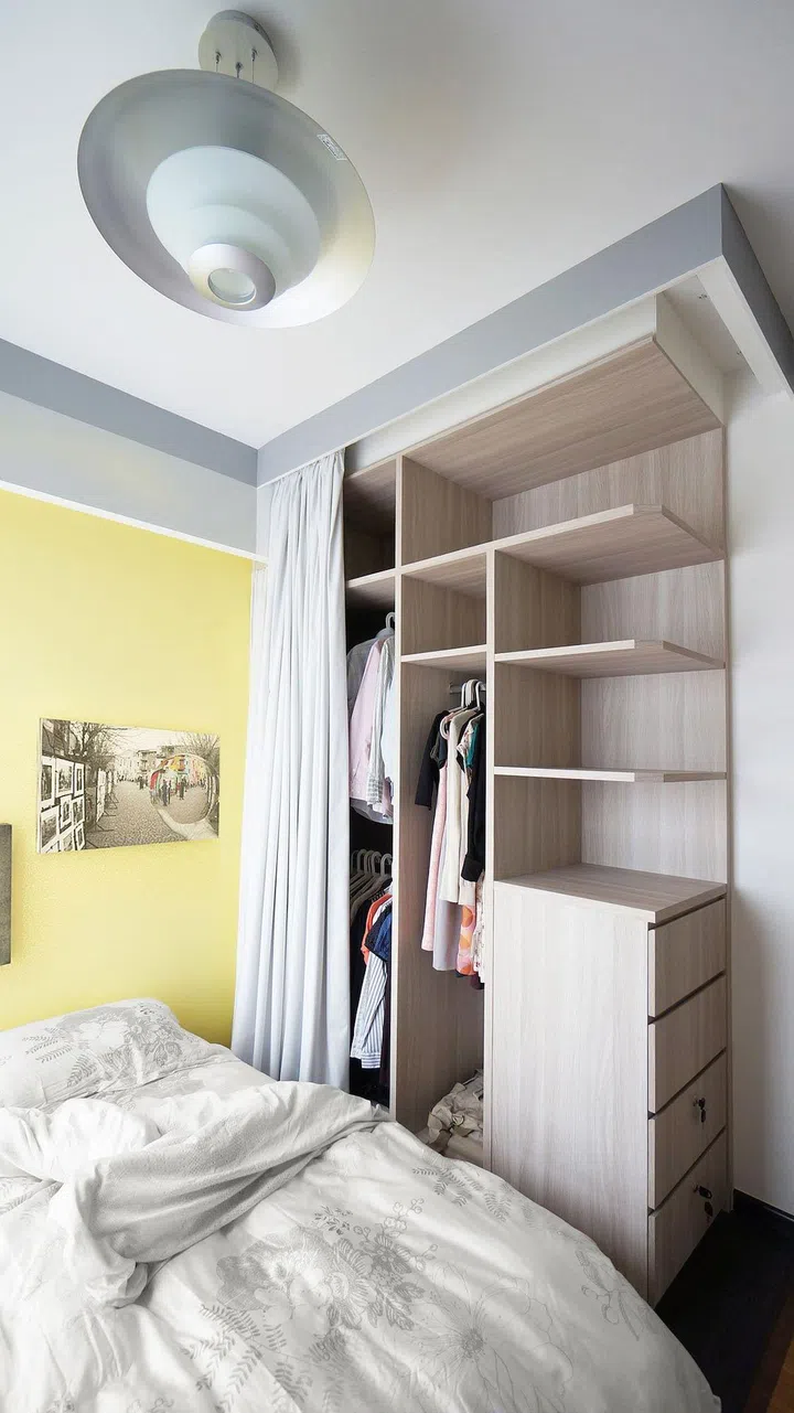 By drawing the curtain apart, the homeowner has direct access to the wardrobe. This is a cool way to optimise the spaces and include plenty of storage without requiring the use of conventional cabinetry.