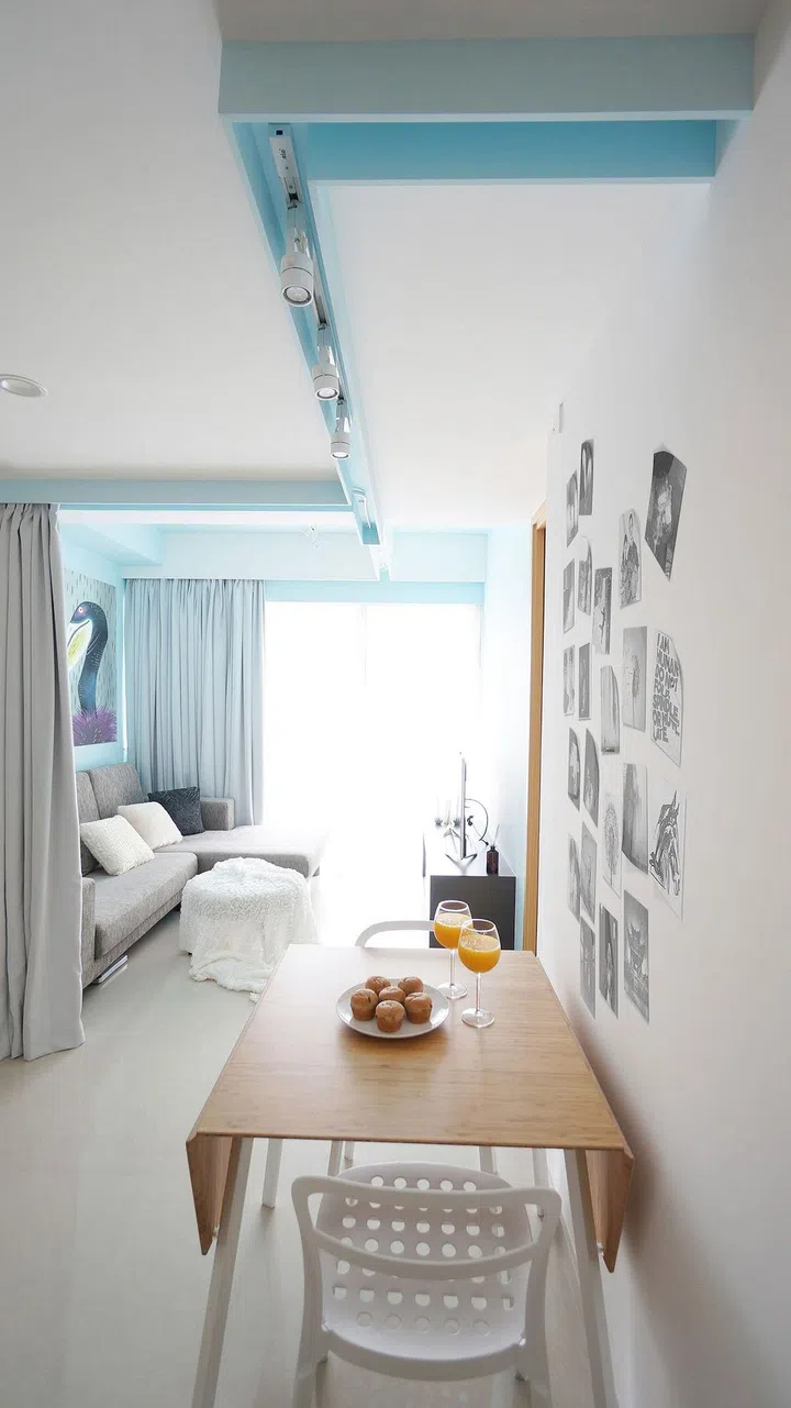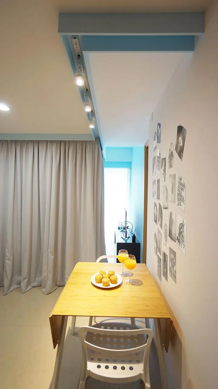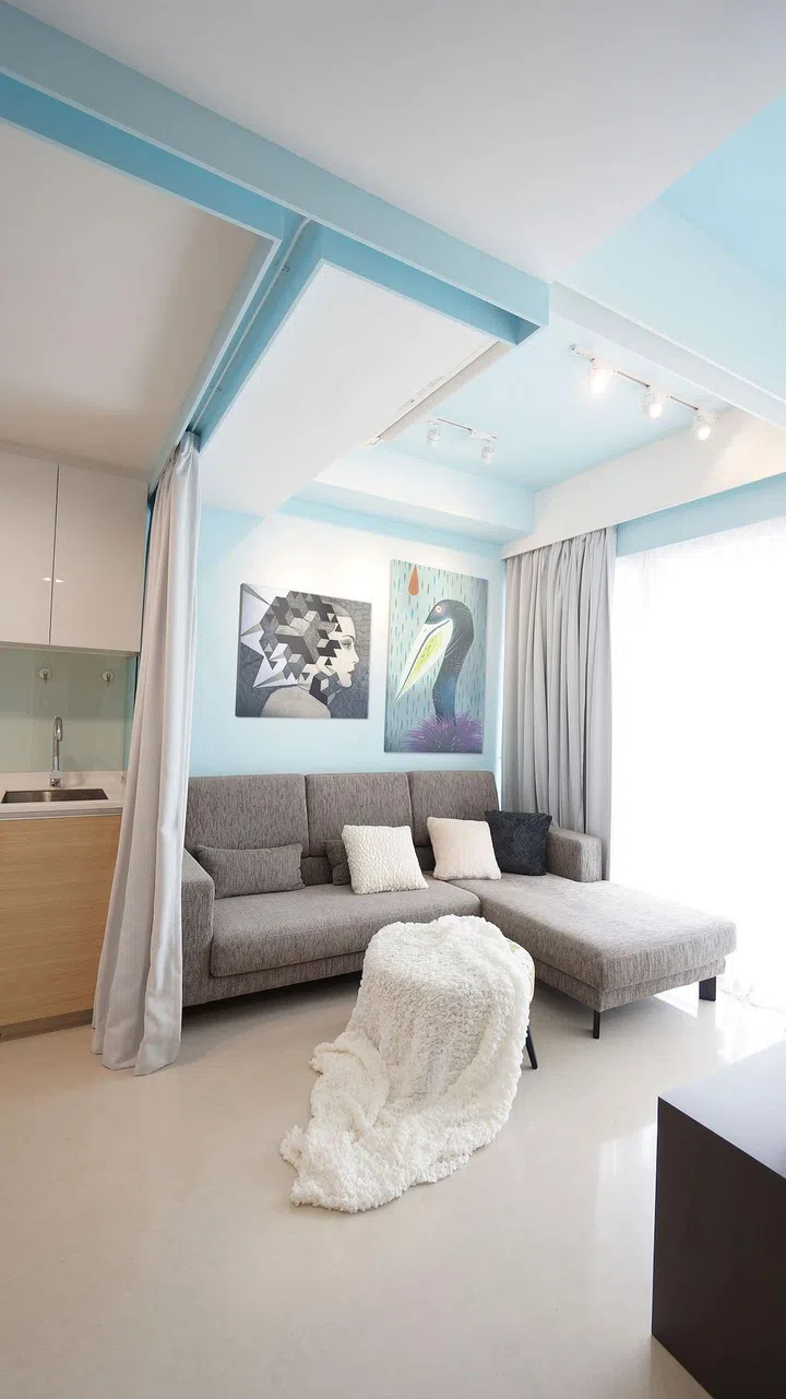 Pelmets in a light blue colour help to conceal the curtain tracking, as well as become the home’s feature décor element. It also hides the placement of spotlights, allowing the home to take one a seamless look.