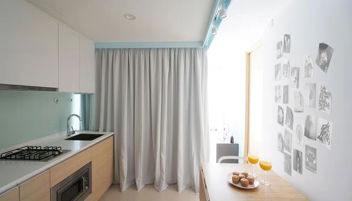 The designers were careful to leave some space so that even with the temporary bedroom, the balcony outside can still be accessed without intruding the various spaces.