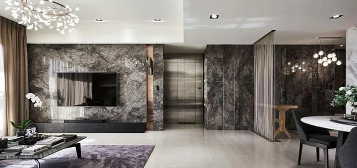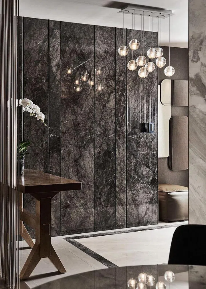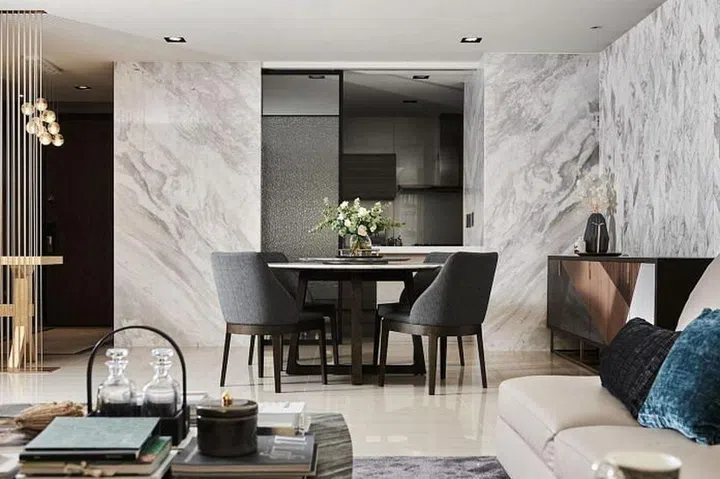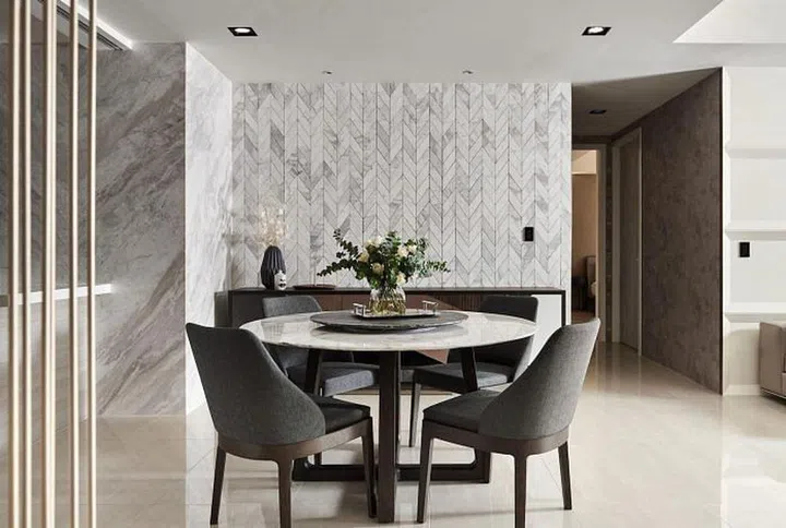 In the back wall, pieces of Cherokee marble tiles are arranged in a Chevron pattern to create a unqiue feature wall next to the dining table.