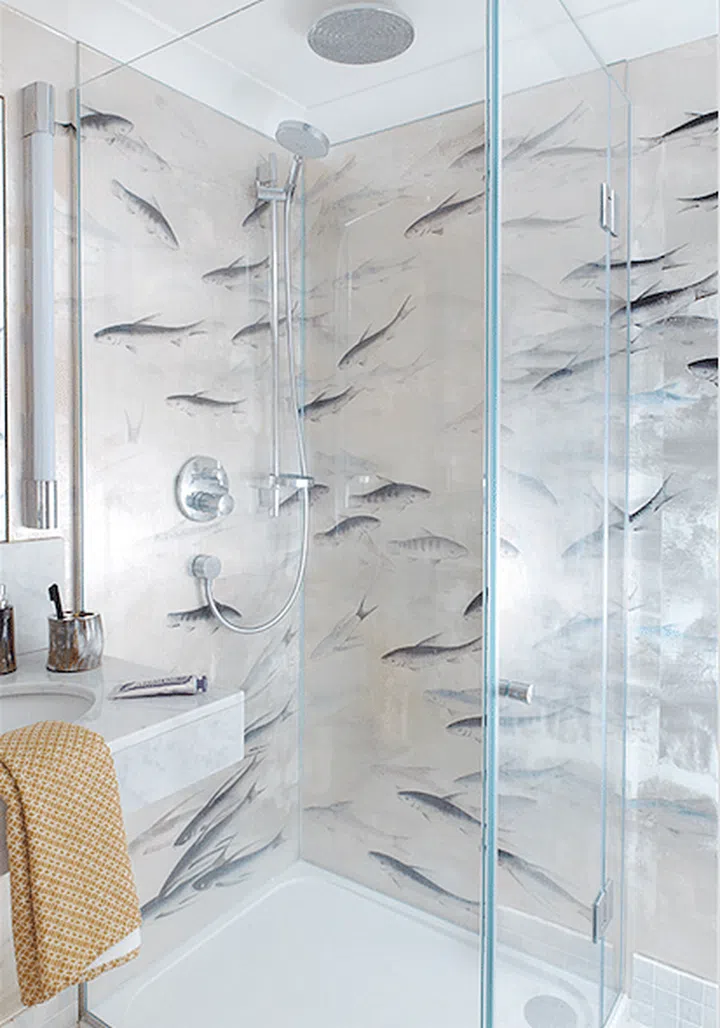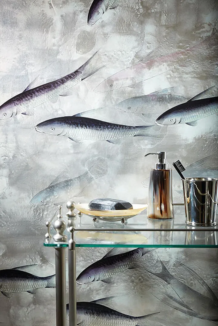 The fluid movement of the fish and the pearlescent antiquing bring to mind images of a shimmering lake, creating an evocative mise-en-scene in the bathroom.