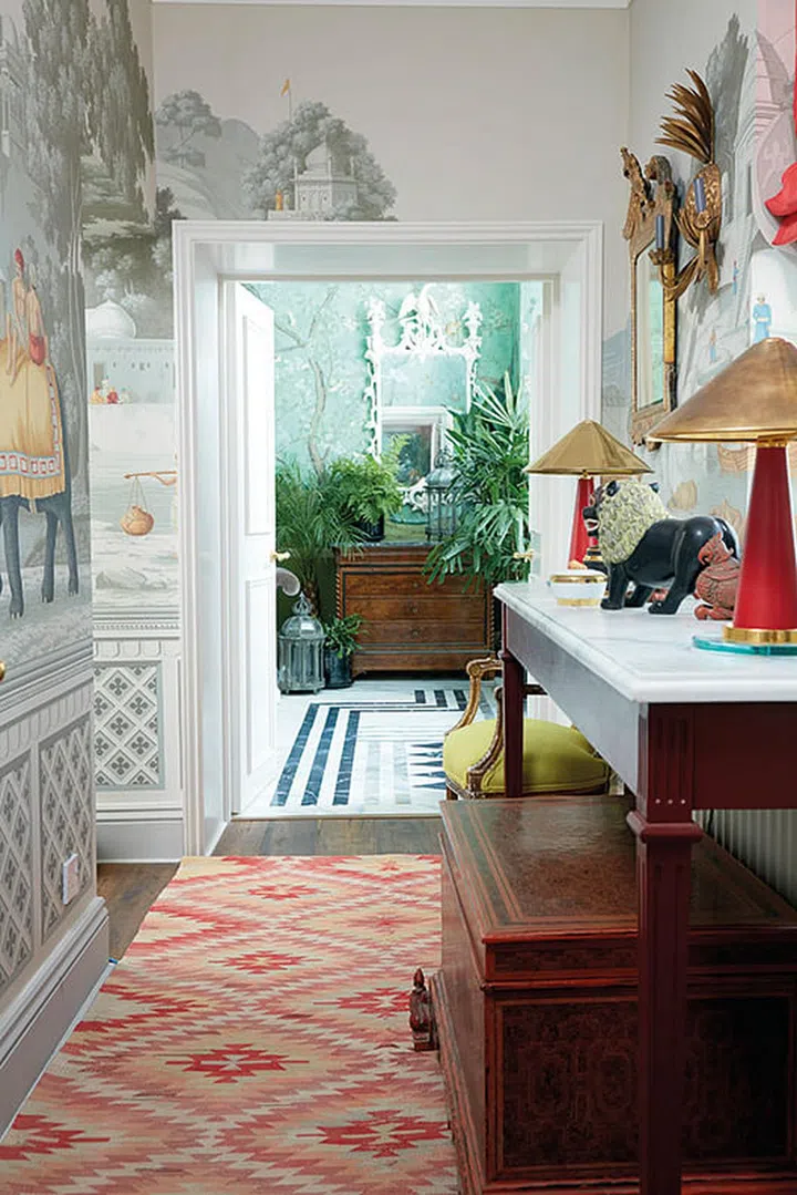 The hallway’s wallpaper depicts early views of India. Traditional artefacts such as the Burma chest complement the theme of a bygone era, while leather and brass lamps from Collier Webb inject a contemporary element.