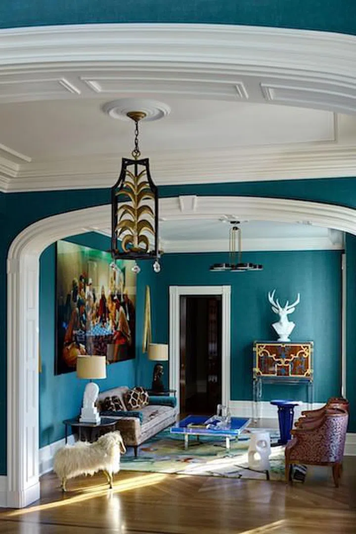 Deep teal is chosen for the walls in the intermediate corridor on the ground floor, which sets a backdrop for many of the homeowners favourite artworks too.
