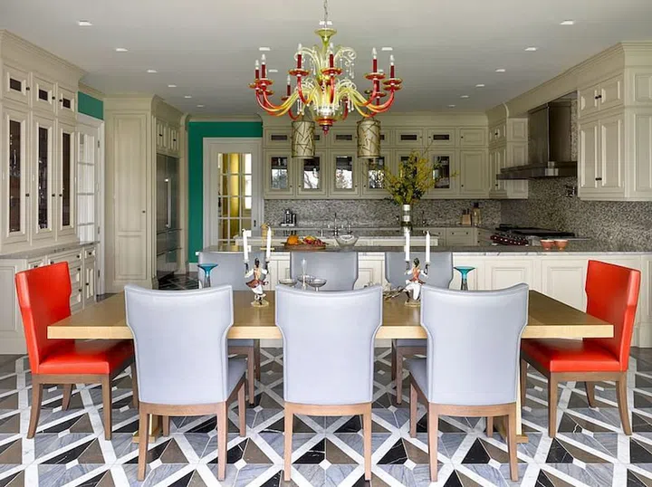 A mix-and-match of grey and red dining chairs, accompanied with an opulent chandelier that hangs above the dining table, creates a classy dining area that sits adjacent from the kitchen counter.