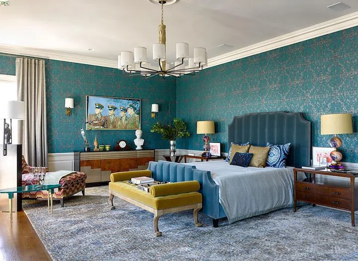 The same colour scheme is chosen for the bedroom, with additional textural effect with the choice of a patterned wallpaper.