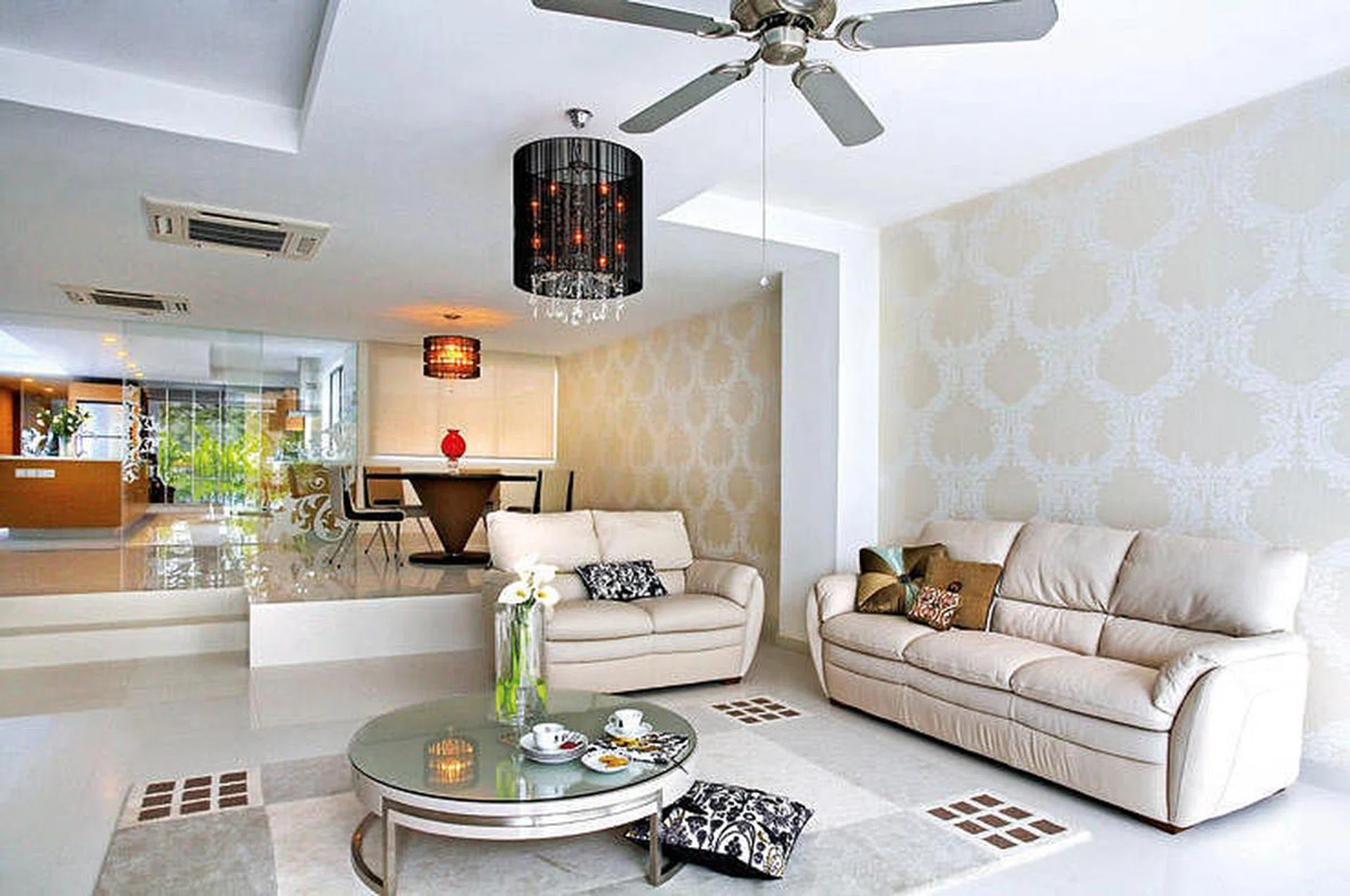 The living and dining areas are kept open and airy, using only a slight shift in floor levels to demarcate them. This clever design technique maintains visual continuity while subtly defining separate functional zones within the open-concept layout.