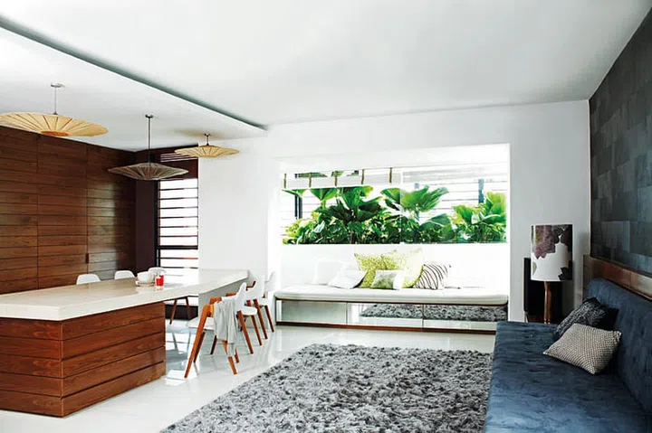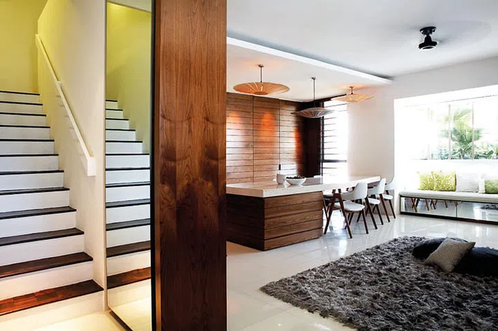 This two-floor condominium apartment in the East gets an overhaul that brings a slice of nature indoors. Designed by Formwerkz Architects, the sliding glass windows let the family enjoy the greenery in the comfort of an air-conditioned room, without having to worry about bugs bothering them.