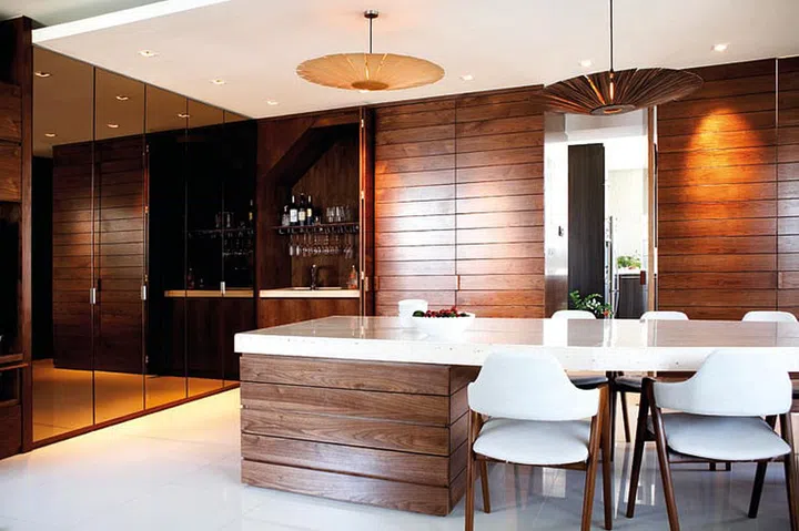 Behind the open-plan living and dining area, is a wall of wood-panelled doors. The wood panelling is actually a textured veneer that designer Gwen selected to create a high-quality look while keeping within the budget.