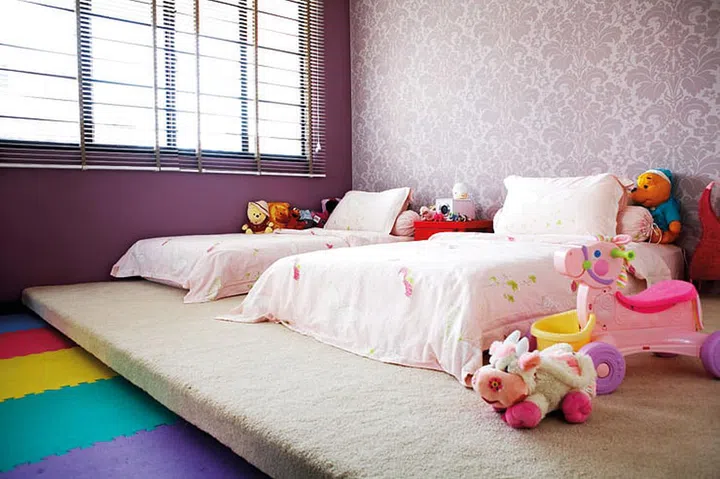The kids' bedroom has a sweet pink and lavendar theme. Gwen made sure to provide adequate storage for toys to keep the space clutter-free. A grown-up wallpaper print balances the sweet pinks of the girls' room.