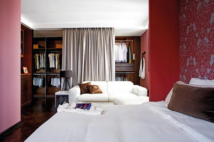 The master-bedroom is a boutique hotel-room-inspired sanctuary with zones for storage, relaxing and sleep. Drapes conceal the well-organised walk-in wardrobe.