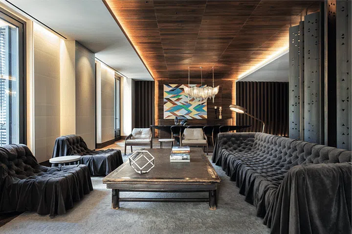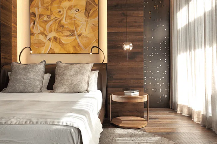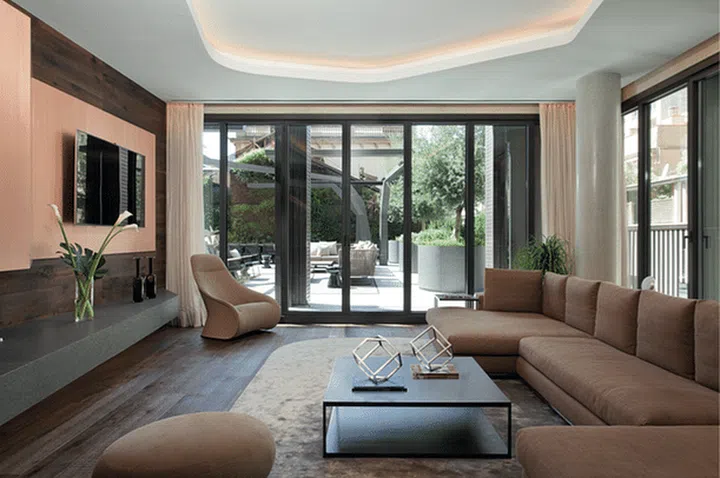 The living space serves as a familial retreat as well as entertainment hub, where rich wood tones blended with bespoke brass screens form an Afro-contemporary backdrop to luxurious furnishings.