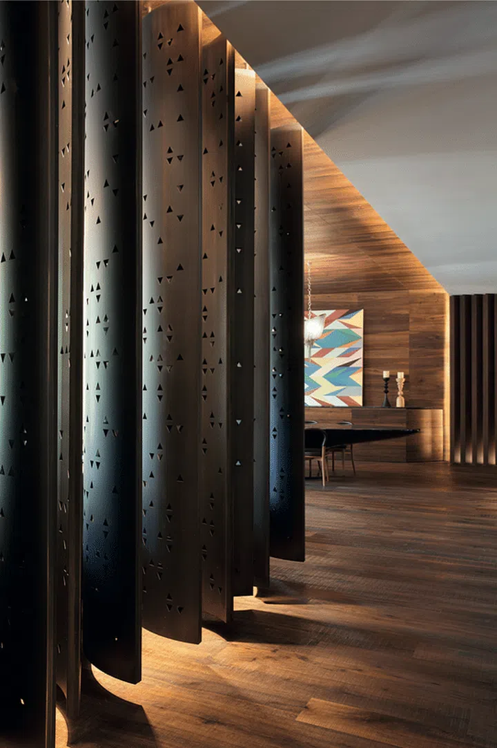 Separating the entrance and living spaces are a row of custom-made polished brass screens, designed with intricate triangular perforations inspired by African beadwork.