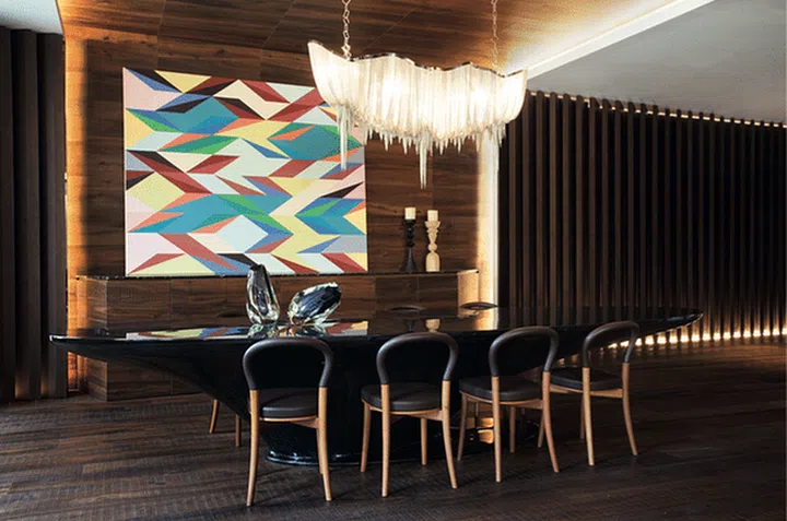 The organic form of the custom-made carbon fibre dining table is matched with the flowy jellyfish-inspired chandelier above. A vibrant painting above the sideboard injects energy into the space.