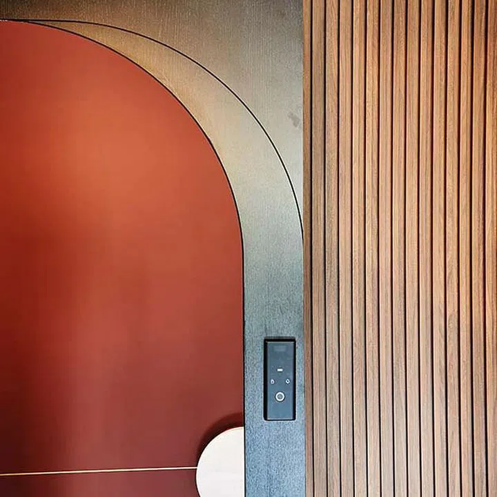 Glass with textured patterns is combined with dark metal frames, and matte laminates with geometric patterns, wood, and arches.