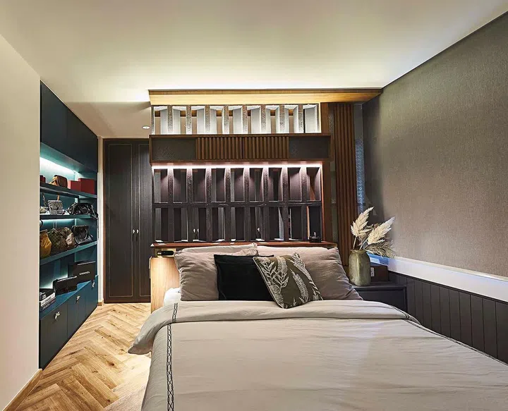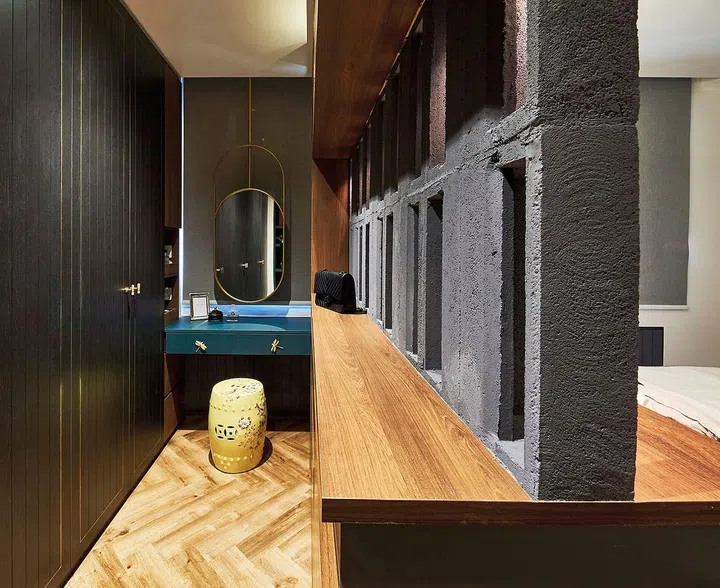 Located at the deepest corner of the floorplan, the master bedroom features a wardrobe area separated by a wall constructed with old-school ventilation blocks.