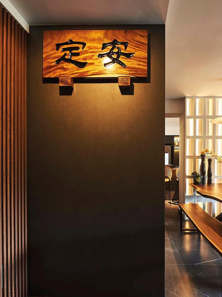 The couple commissioned a wooden plaque with Chinese characters ‘at ease’, which is Alvin's family motto, to set the mood of the home.