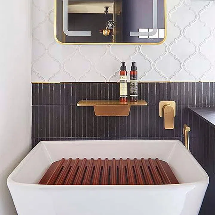 The quintessential patterned tiles are present, but they are used sparingly as accents in strips and with subdued colours.