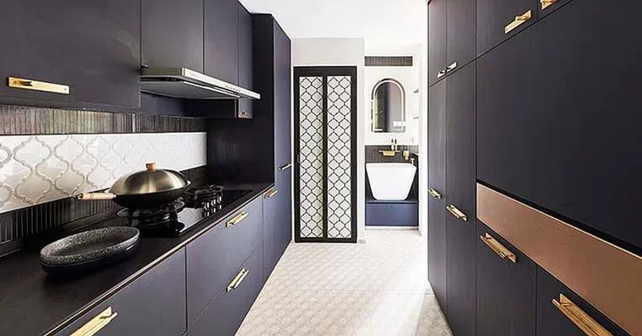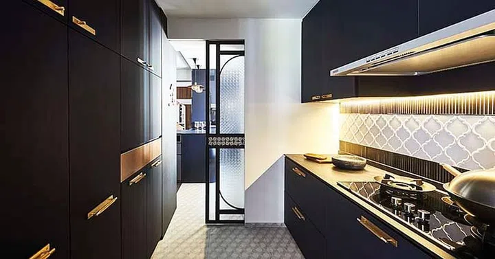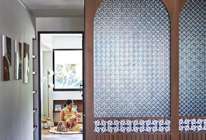 To the left of the bar is the dry and wet kitchens, which are separated by a sliding door finished with frosted patterned glass and Peranakan tiles.