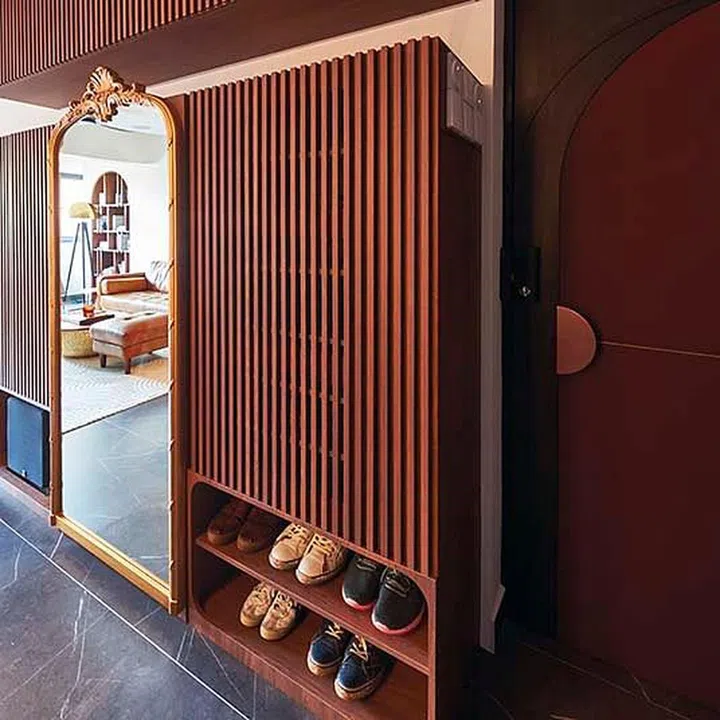This ornate mirror is actually a door to the shoe rack.