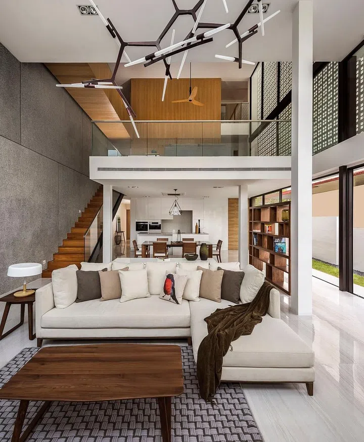 The interiors of this semi-detached house in Singapore have a contemporary aesthetic, with linear and angular elements.