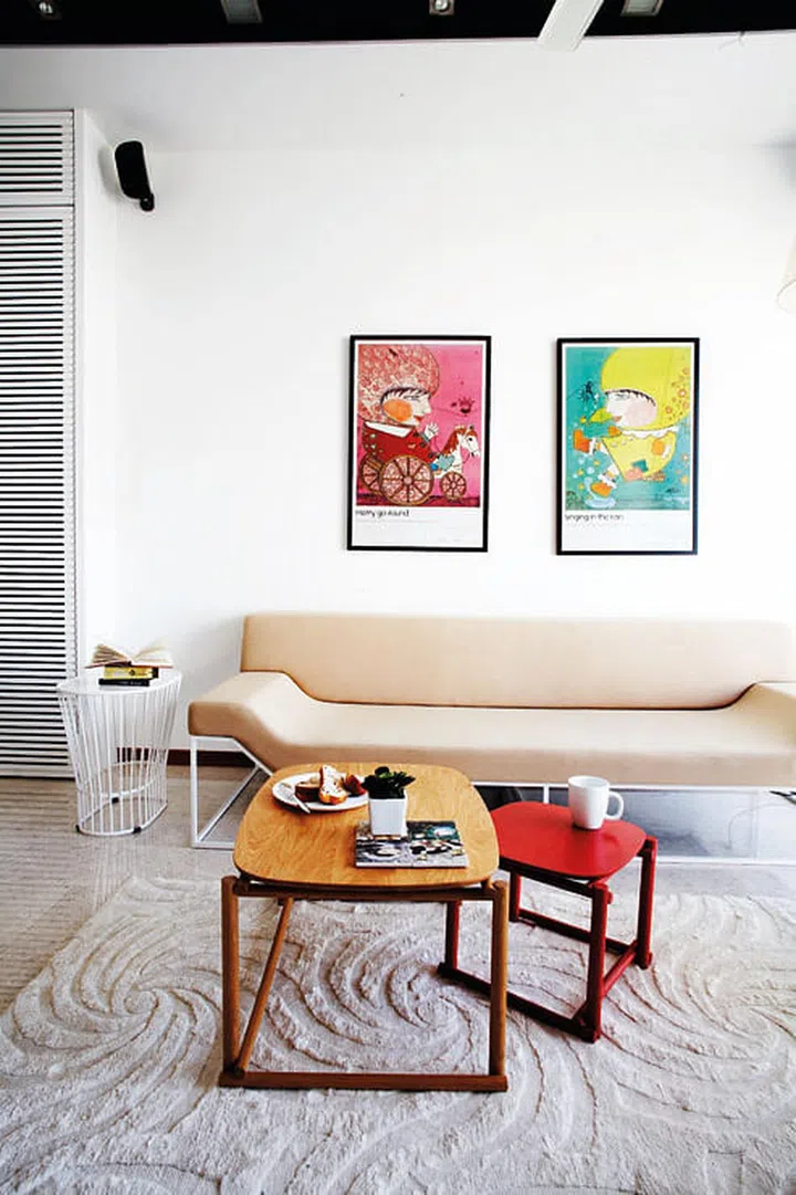 The box frame leg of the sofa and nest of the tables maintains the apartment's airiness.