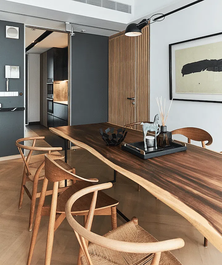 The dining table was customised according to Woon’s requirements, from the length right down to the legs.