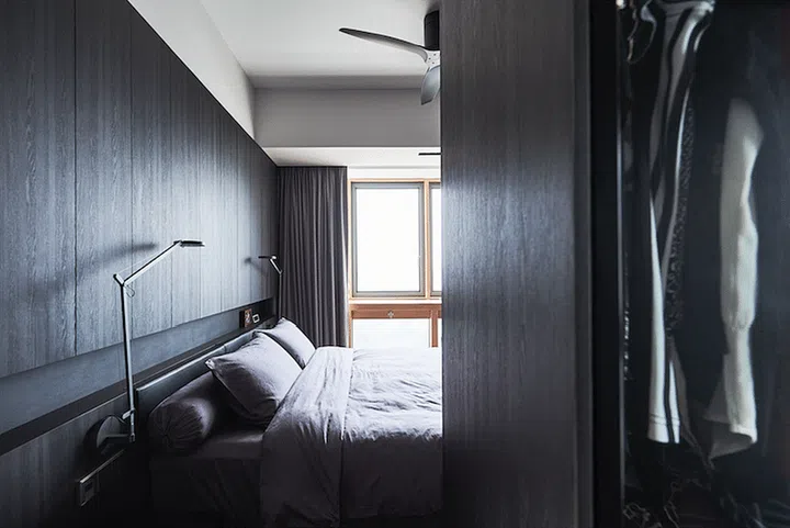 Despite the space constraint, Woon managed to incorporate a wardrobe designed like a walk-in closet in the master bedroom, with additional small display shelves on the other side to make the most of it.
