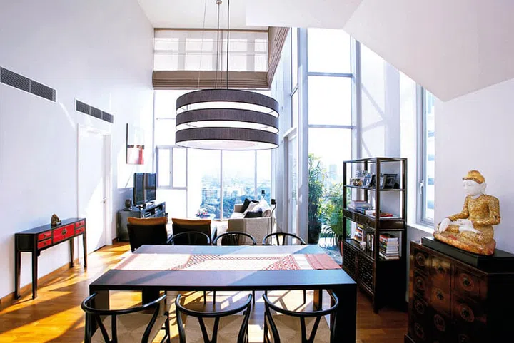 Orient-inspired Wishbone chairs by Danish designer Hans Wegner are matched with a lantern-like Planet pendant lamp from Italian brand Giorgetti in the loft's dining area.