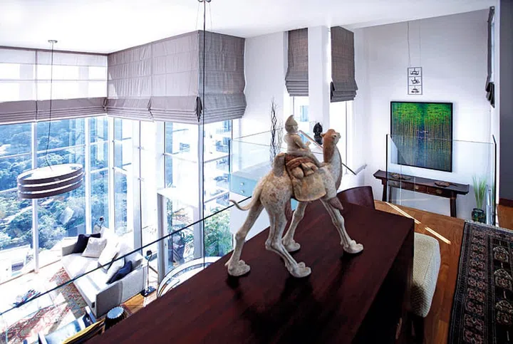 They approached designer Karen Tan of One-stop Concept, who combined oriental-inspired European designer pieces and actual antiques in the home. An antique sculpture of a camel watches over the airy, double-volume living space.