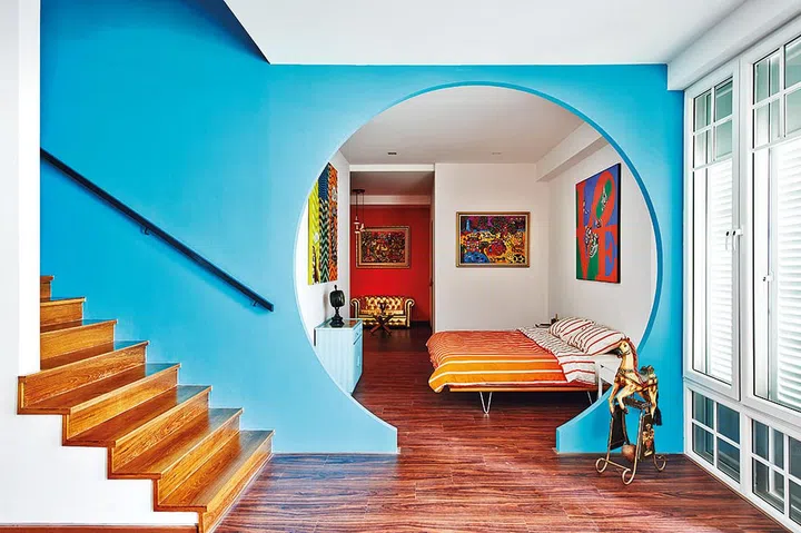 Adjacent to his bedroom is a chilli-red study area, where he collaborated with Nippon Paint to create the vibrant and bold color scheme that sets the tone for the entire house.