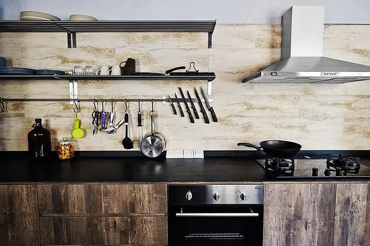 Along the corridor leading to the bedrooms, the alcove under the building’s common staircase was fitted with bookshelves finished with woodgrain laminates from Lamitak.