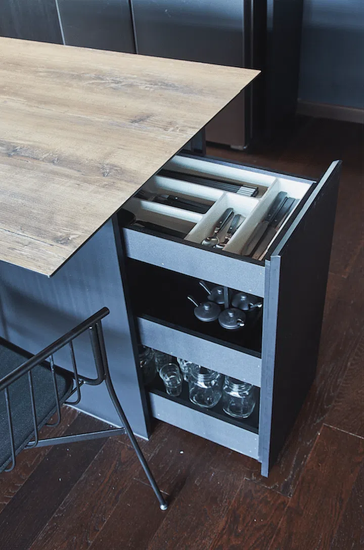 Customising the dining table cum kitchen island gave the homeowners the flexibility of adding storage to maximise space, such as with this pull-out drawer for cutlery.
