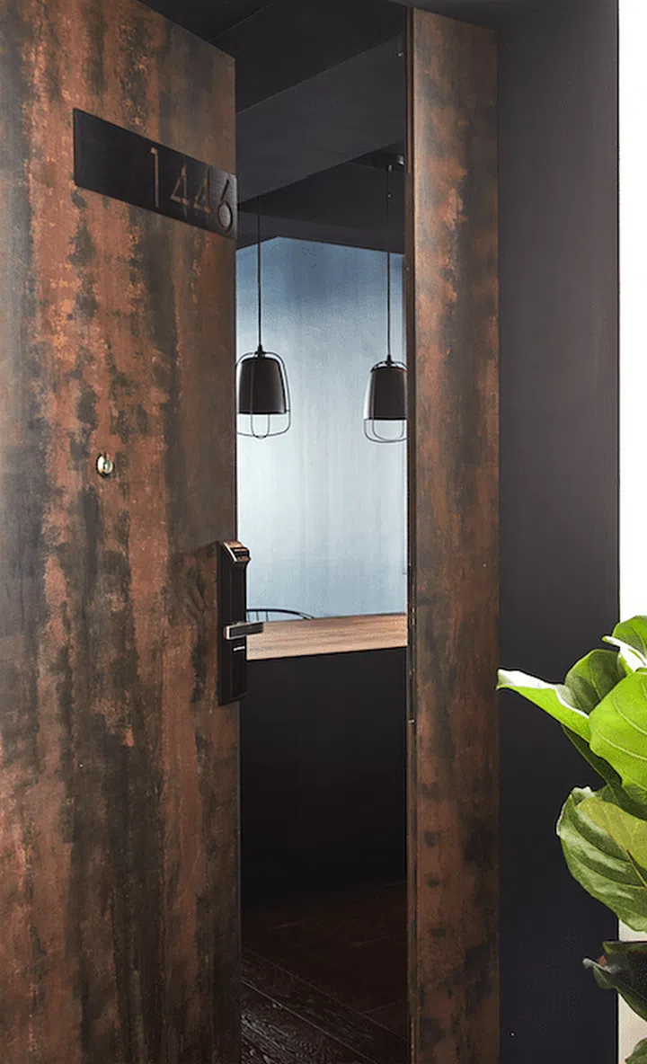 The main door was replaced to achieve a rusted effect, contrasting against the engineered dark wood floor from Wood Culture.