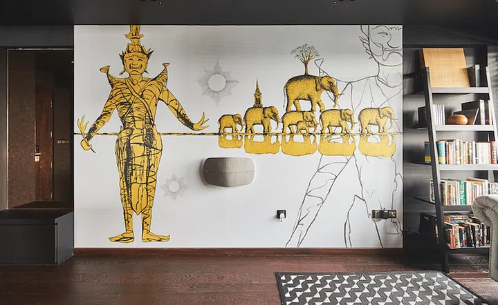 Celine is half-Thai and connecting with her roots was a key inspiration when conceptualising her home design, which resulted in an impressive wall mural taking centre stage in the living room.