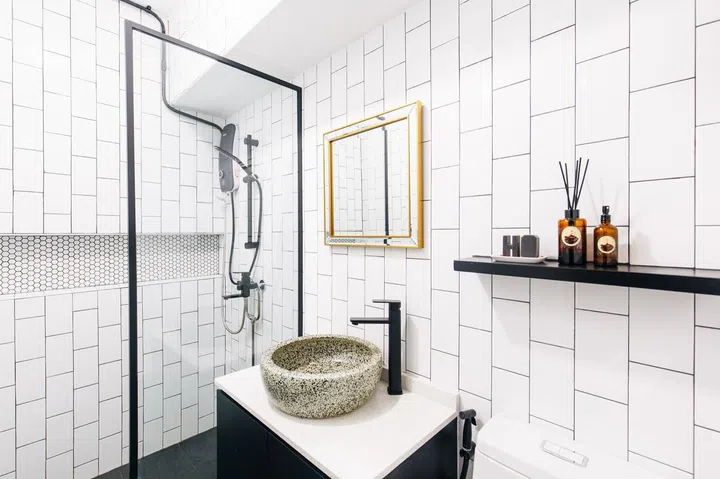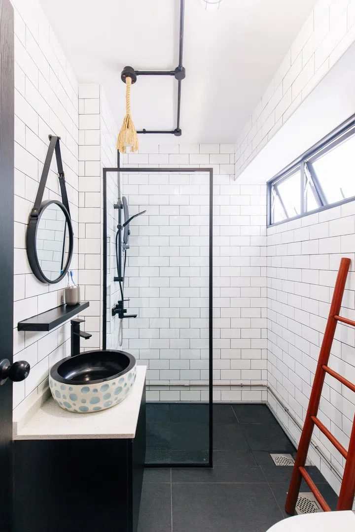 The common bathroom has a palette of black and white. A textural quality is added with the clever choice of subway tiles laid in a vertical fashion.