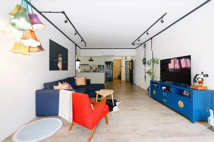 As a result, the walls in the living room were kept white to allow room for splashes of colours such as with the Just Anthony TV console and cushy L-shaped sofa in deep blue. A natural wood-look vinyl flooring here adds warmth and complements the decor accessories, which range from pieces in the oriental-, vintage- and even Peranakan-inspired styles.