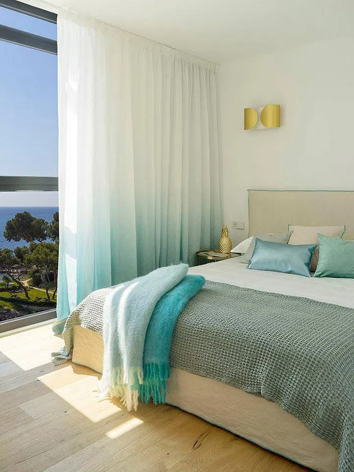 The turquoise hues in the bedroom complement the sea views perfectly too, for a complete in-outdoor experience!
