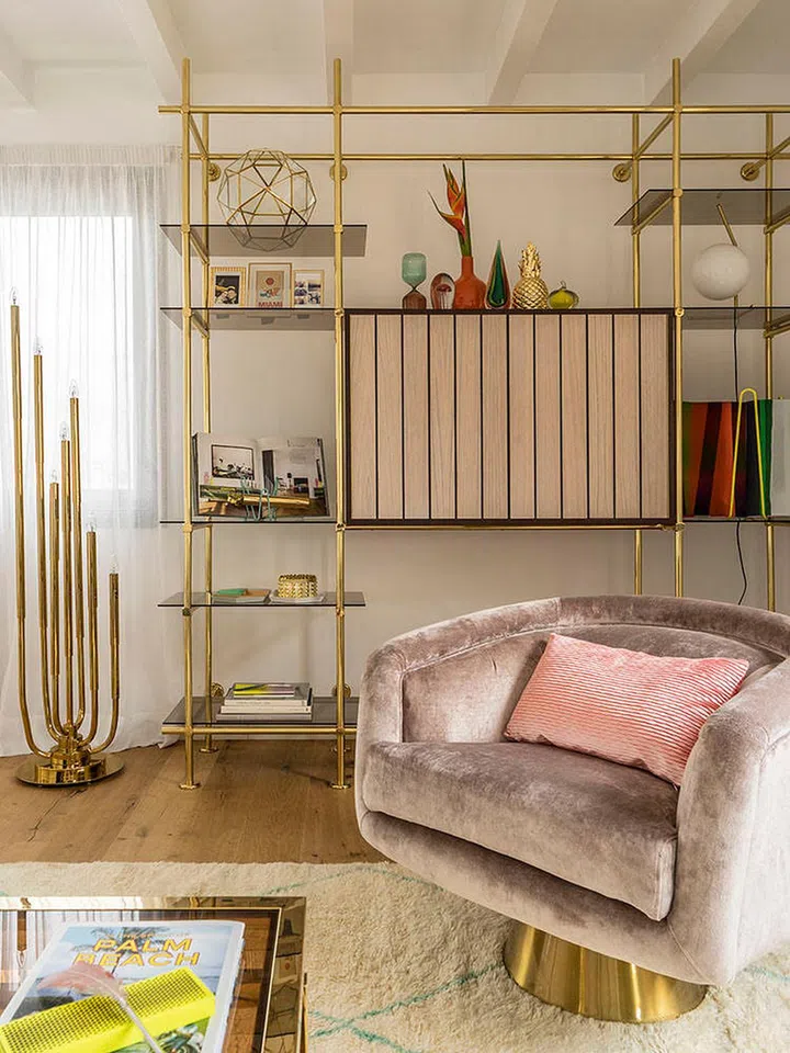 Gold hues — from pieces including the open shelving and Delightfull Stardust lamp — and plush furniture add to the luxurious ambience of the interiors.