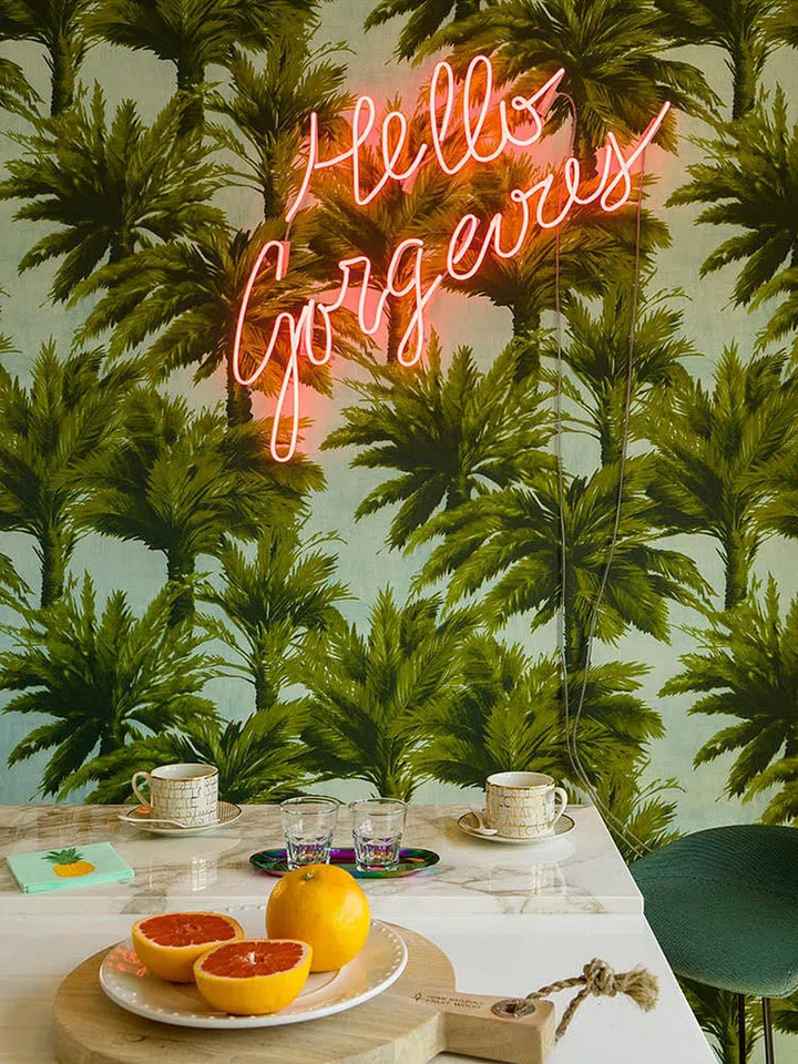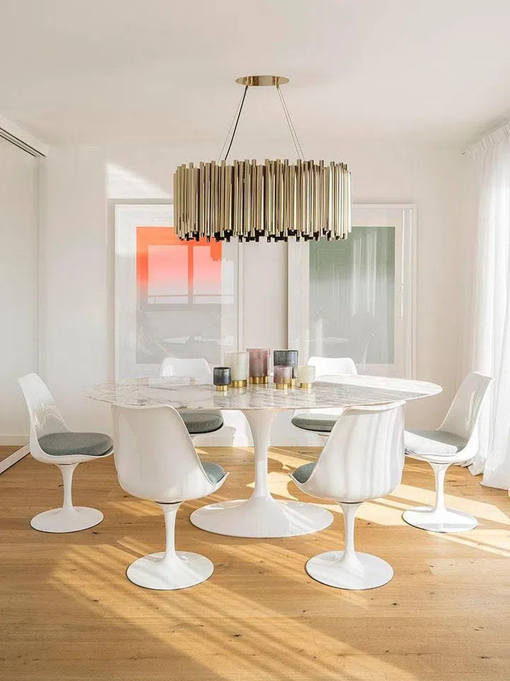 These include statement pieces such as the Delightfull Brubeck Suspension lamp hanging above the dining table, which stands out against the Knoll marble dining table.