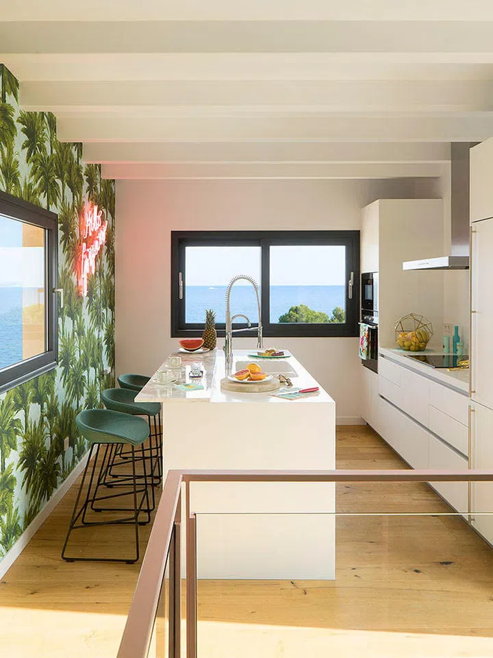 Botanical-inspired wallpaper from Pierre Frey is added in the kitchen for a splash of colours, alongside the white cabinetry.