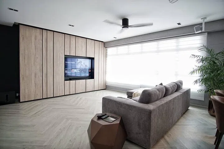 Together with designer Toh Zu Huai of erstudio, a light ash grey wood-like laminate was selected for the in the living room. This design also hides lots of storage space.