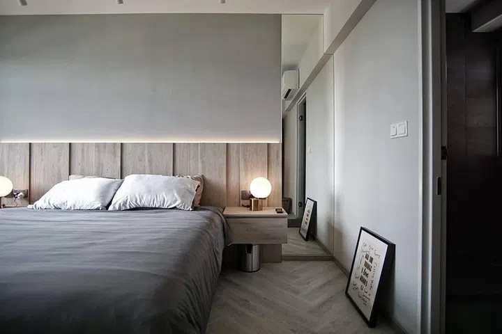 The bedroom is now a cosy space complete with a customised headboard with a wood-look finish.