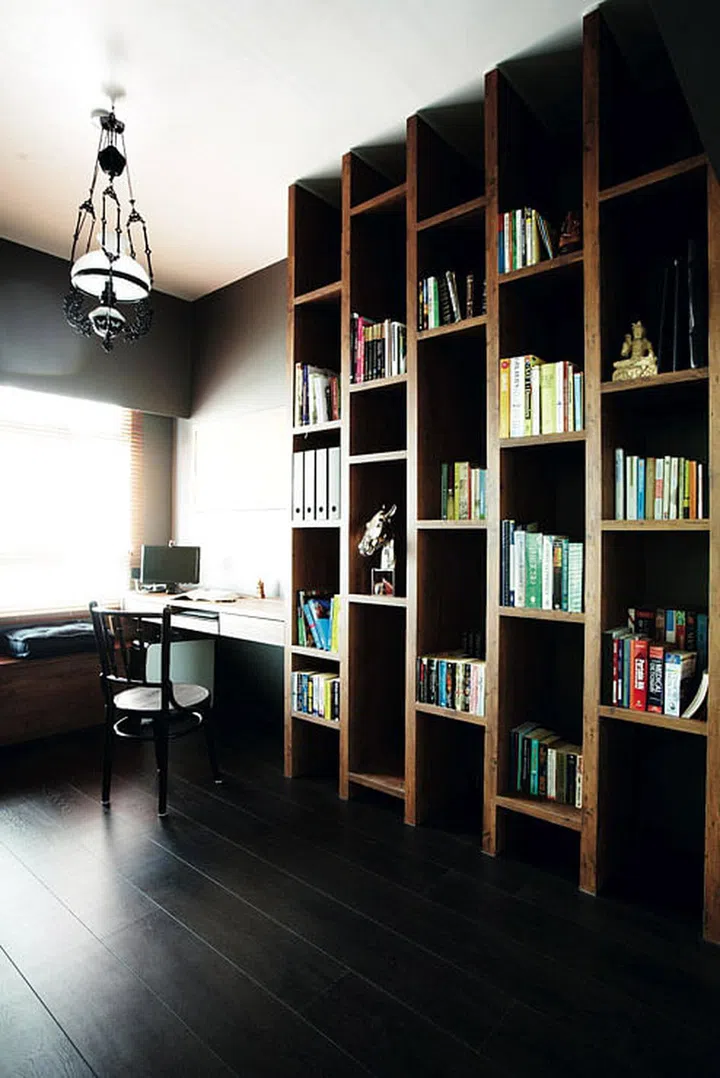 They spent under $40,000 to renovate this four-room apartment. The irregular bookshelf compartments break up the monotony of the room.