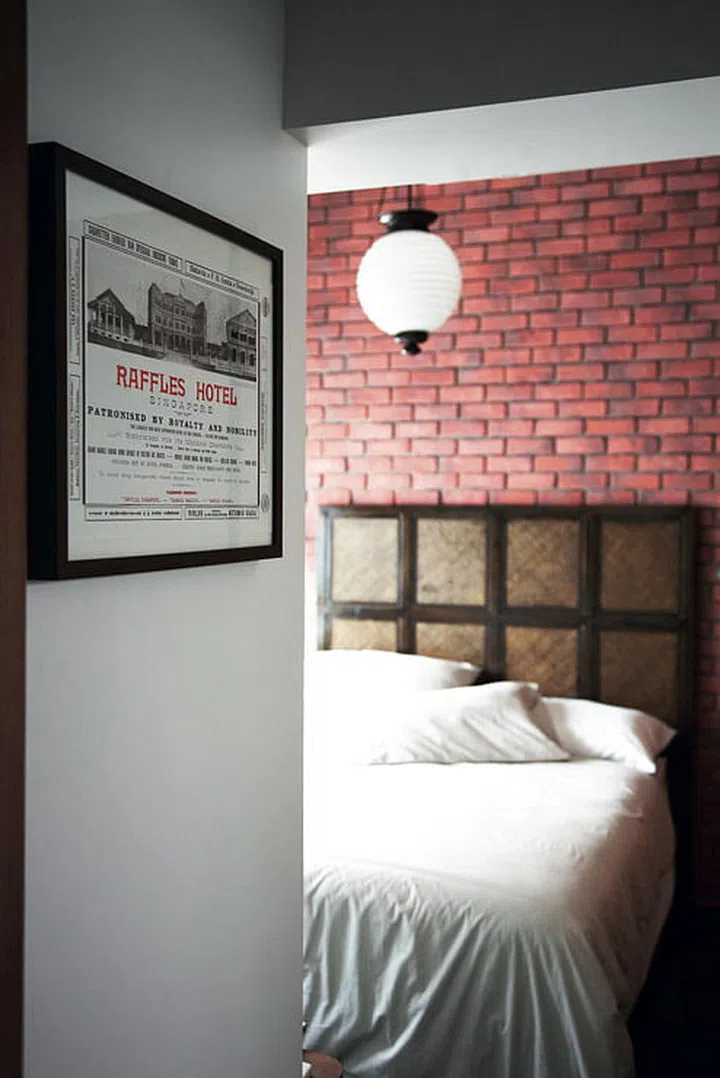 The raw brick wall and uneven wood grain of the wardrobe panelling lend the room an earthy, rustic feel.