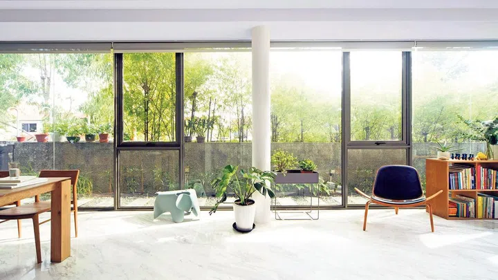 A widescreen TV is typically the main focus in the living room, but not in this home. Ms Luo says they both love reading and collecting books, and their bookshelf heaving with design, architecture, philosophy and Chinese literature tomes is the centre of attention. If they want to watch TV, which doesn't happen often, they watch on a projection screen.