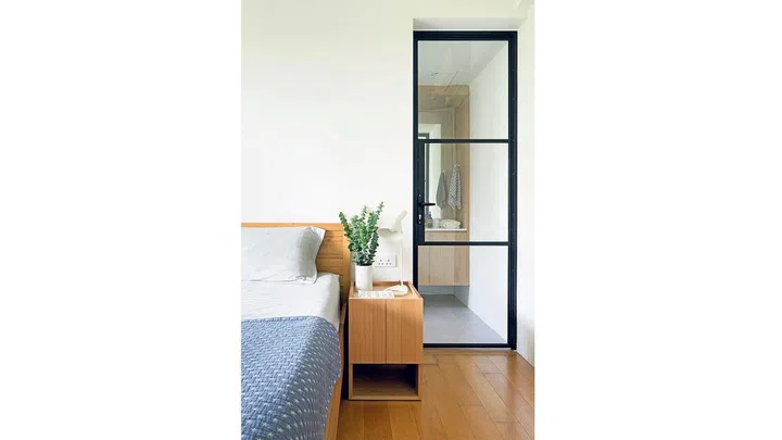 Instead of having wooden doors for the bathrooms, Mr Neo designed for them to be glass on a black aluminium powder-coated frame. Such doors not only meant that the bathrooms are now brighter, but they are also aligned with the home's clean interiors. Ms Luo is especially happy with the glass doors. "They look modern and sophisticated," she says.