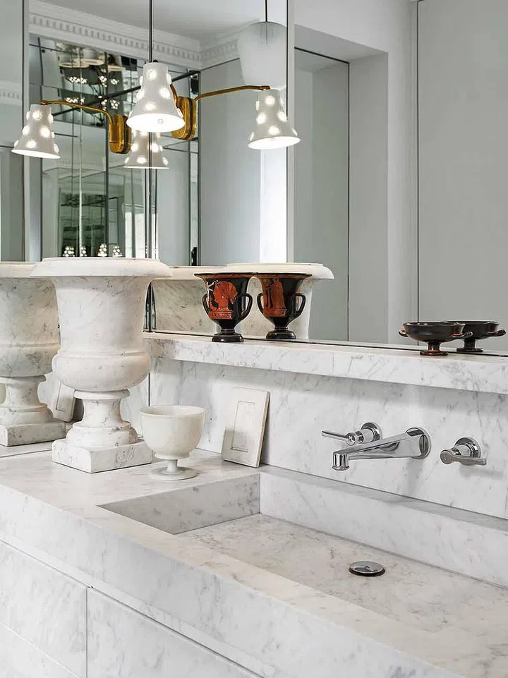 A ’40s Swedish ceiling lamp, ’70s Italian sconces, ’40s Italian stools and Directoire handles make the bathroom stand out.