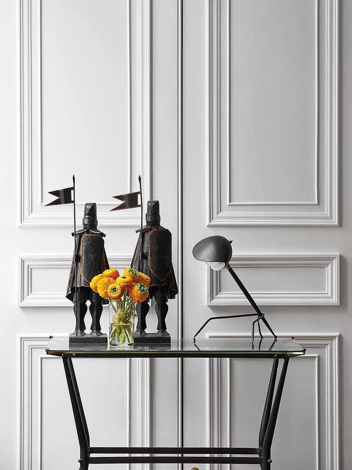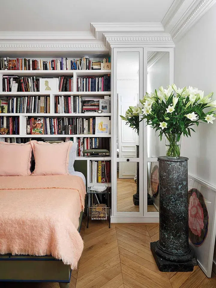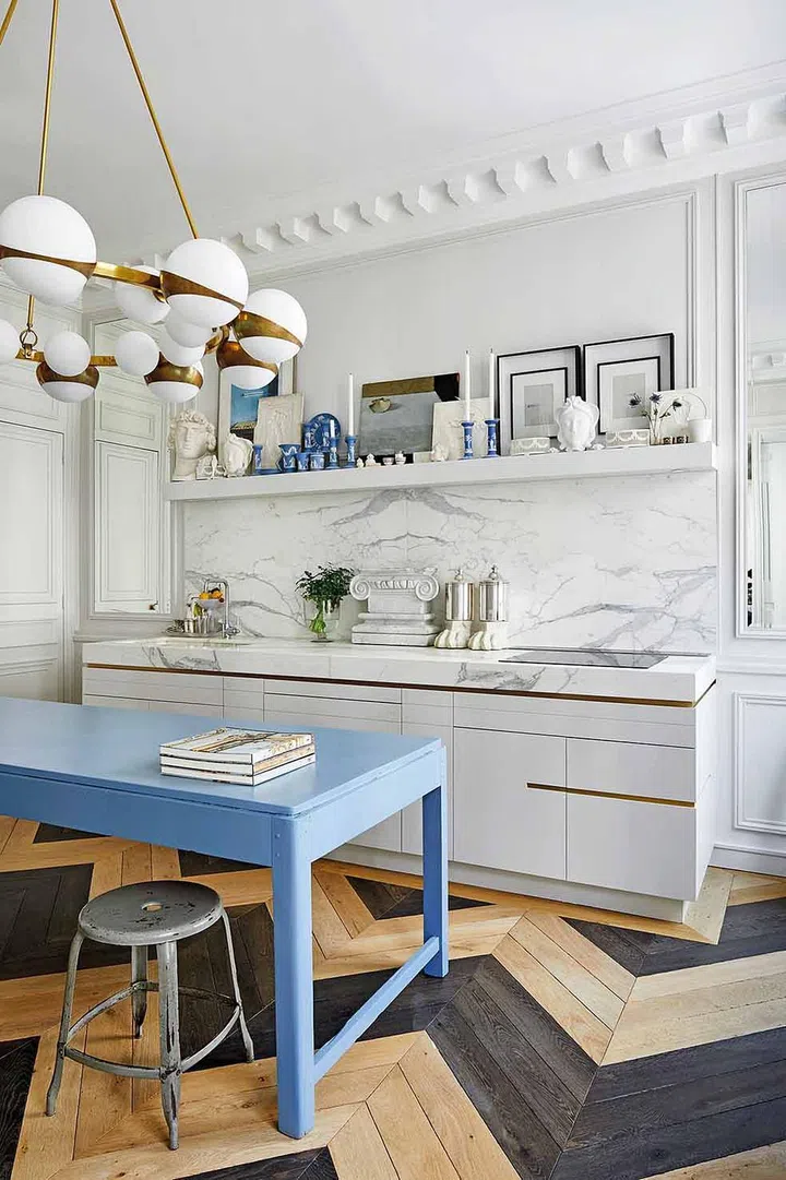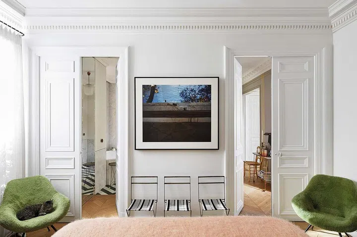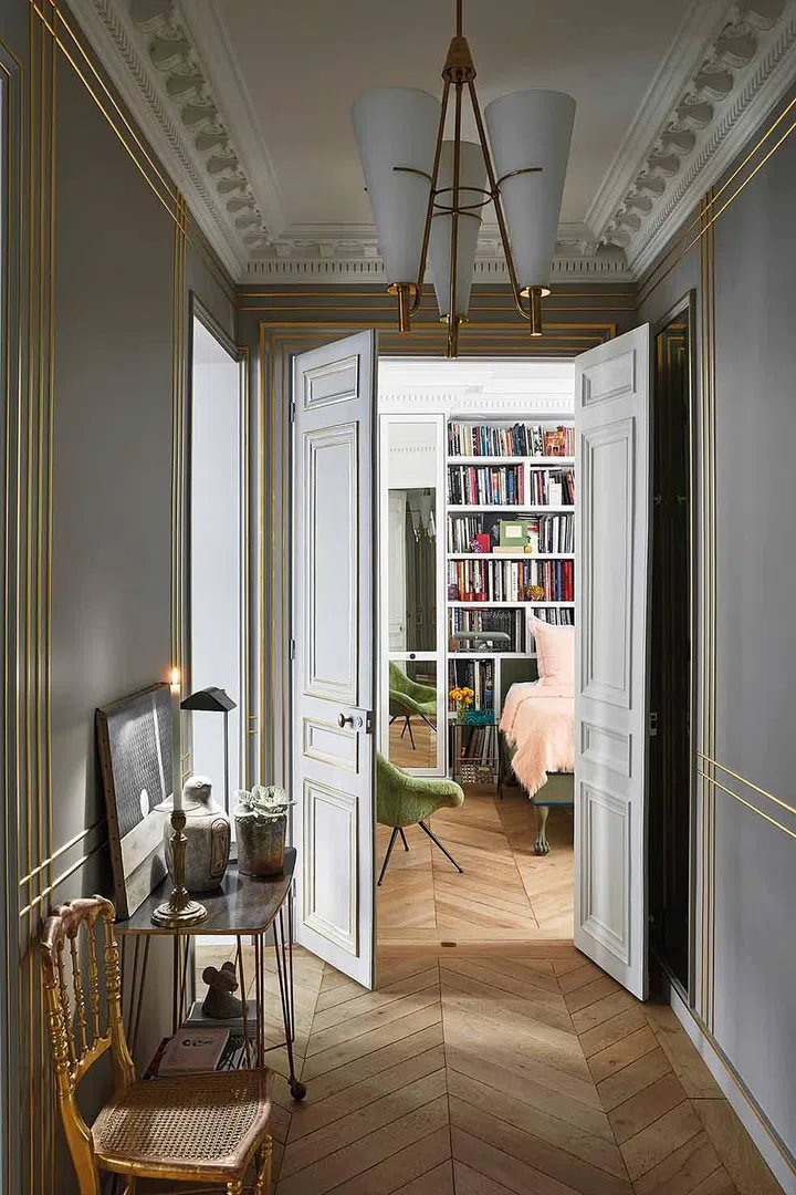 It took six months for the trio to finalise the design. With only one bedroom, the apartment has generous common areas, high ceilings, boiserie (wooden panelling), elegant neoclassical mouldings, French doors trimmed in gold leaf and herringbone parquet flooring in a traditional chevron pattern inspired by the late French decorator Jean Royere.